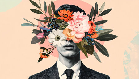 Artistic halftone person collage with flowers, business creative ideas poster concept. Trendy graphic on simple background.