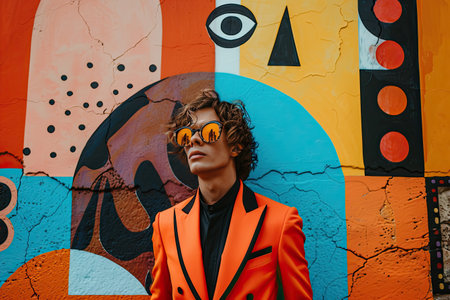 Stylish Man in Orange Suit and Sunglasses Posing Against Vibrant Abstract Mural