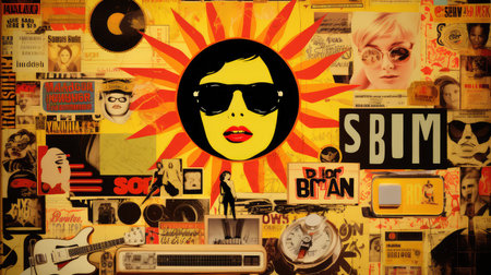 Stylish man with sunglasses poses against vibrant collage of posters, creating modern backdrop. Ideal for fashion and lifestyle content.