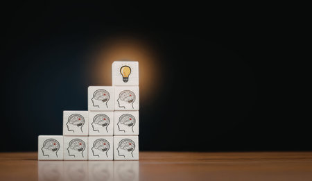 An image depicting a stack of blocks, each with a brain icon, leading up to a block with a glowing light bulb, symbolizing the process of creative thinking and innovation.