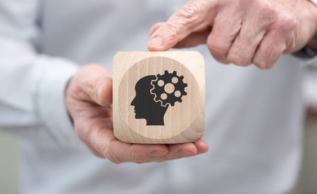 A hand is holding two wooden blocks with black silhouettes of heads and gears on them, one above the other in perspective. On top, there's an arrow pointing right to show movement from left to right. The background features various business icons such as graphs, light bulbs for ideas, or a progress sign. It creates a visual representation of key elements like professional development in the businessman's brain focus concept. --ar 3:2 --v 6.1 Job ID: 16f0f67a-ced5-40c5-a797-27263bbb554d