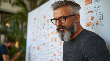 A Thoughtful Bearded Man Explains Ideas and Concepts on a Whiteboard During a Creative Meeting
