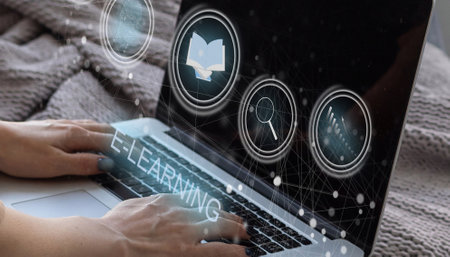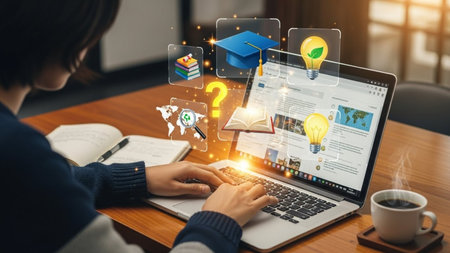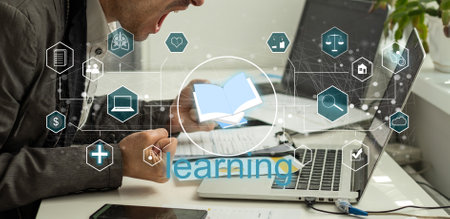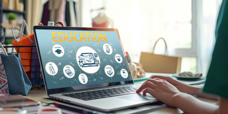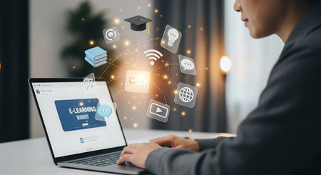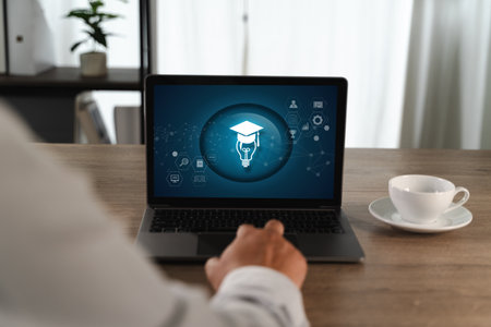 An e-learning platforms person working laptop with digital education icons floating above desk, symbolizing online learning and digital education
