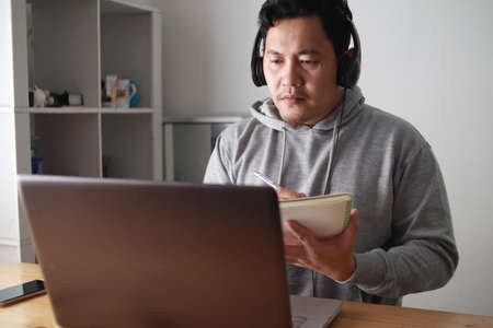 Asian female student studying remotely using laptop from home. Taking notes in a daily notebook while looking at computer screen, Learning Online and education during the epidemic of Coronavirus.