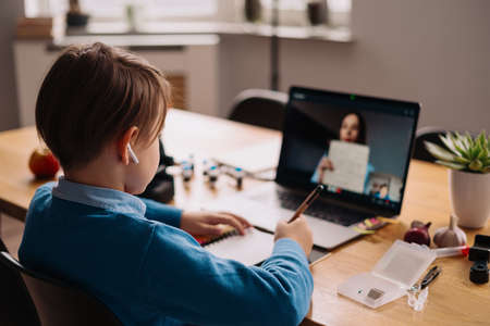 A Preteen boy uses a laptop to make a video call with his teacher. The Screen shows an online lecture with a teacher explaining the subject from class.