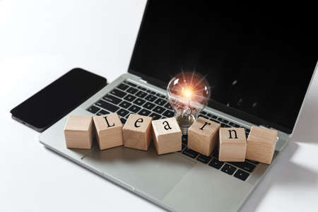 Wooden block cube with text LEARN with light bulb bright light flare on laptop. think creative innovation. e-business online brainstorm, learning vision and ideas concept.