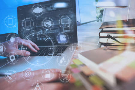 E-learning Online Education concept - Hand Fingers pressing on computer keyboard and screen with education icon and internet or technology connection lines in blue tone