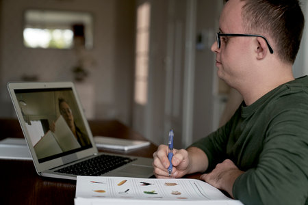 Caucasian man with down syndrome having lesson online