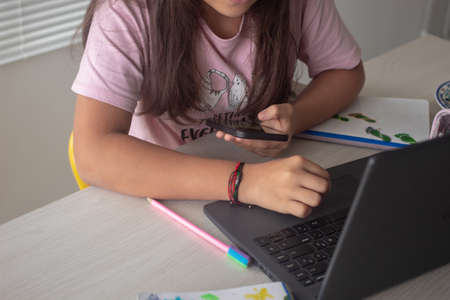 Children and technology. Girl holding a phone and using a laptop. Studying from home. Close-up