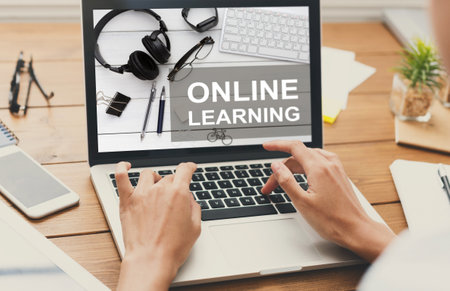 Female hands typing on laptop with online learning inscription on screen, cropped. Unrecognizable woman having educational courses on Internet, sitting at workdesk, online training, collage