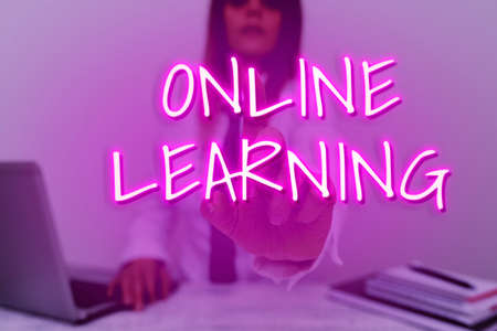 Text caption presenting Online Learning. Concept meaning Larning with the assistance of the Internet and a computer Teaching New Ideas And Designs, Abstract Professor Giving Lectures