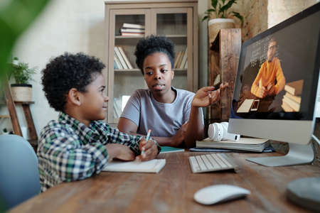 Little schoolboy looking at his teacher on computer screen during online lesson