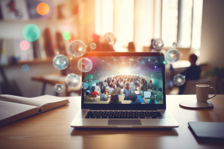 A vibrant image showcasing a laptop screen filled with multiple participants engaged in a video conference, reflecting remote work dynamics in a cozy home setting.
