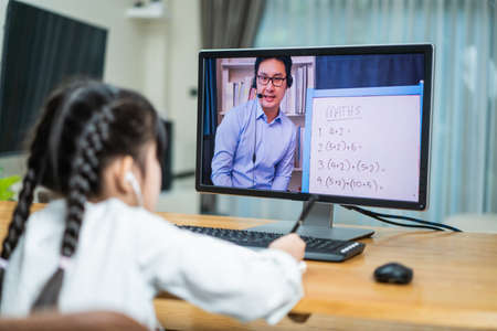 Asian young girl look at virtual video online, learn on laptop at home. Homeschool little kid use computer study and listen to school teacher by digital remote conference meeting due covid19 pandemic.