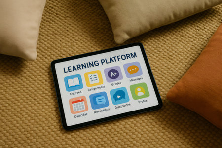 Digital tablet showcasing an online learning platform interface, placed on a cozy carpet with pillows, suggesting a comfortable home studying