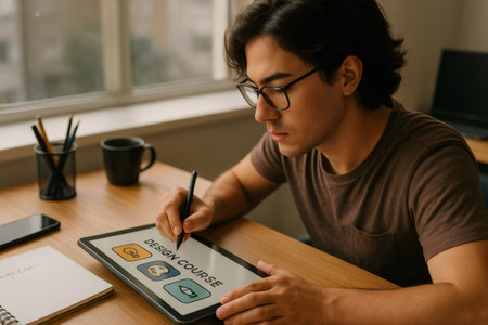 Focused young designer attending online design course using tablet and stylus pen, sitting at desk in home office