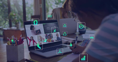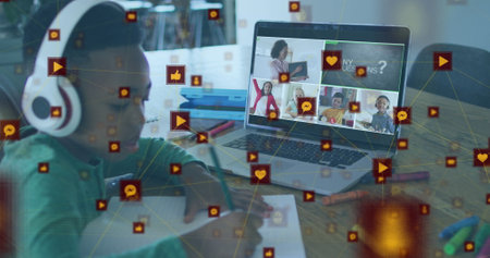 Image of digital icons over african american boy doing homework looking at laptop at home. School and education technology concept