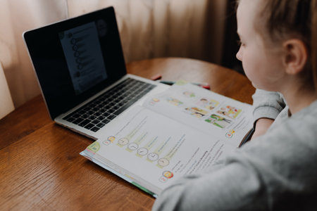 A cute girl with a PC and a book is studying English. Education, technology and children concept. High quality photo