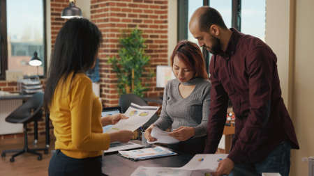 Diverse team of coworkers analyzing business charts on files to plan marketing project and work on company development. Man and women using statistics to research e commerce in office.