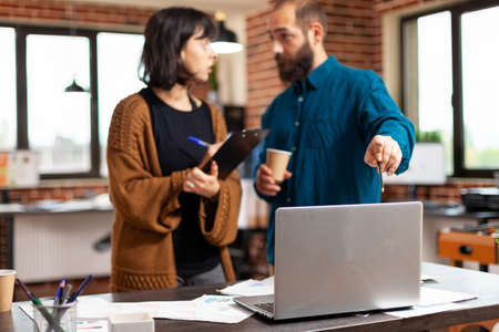 Businessman explaining marketing project ideas to businesswoman showing data rate on laptop computer discussing company strategy. Collegues working at business presentation in startup office