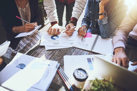 What does the data say. a group of colleagues having discussing paperwork during a meeting at a cafe.