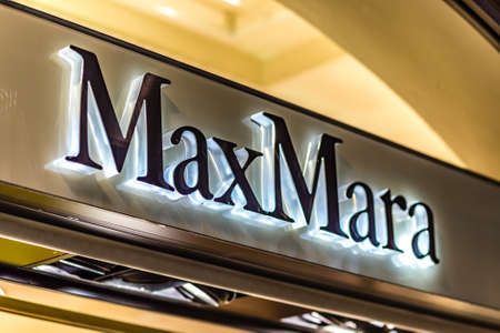 RAVENNA, ITALY - JANUARY 17, 2019: lights are enlightening MaxMara logo on storefront