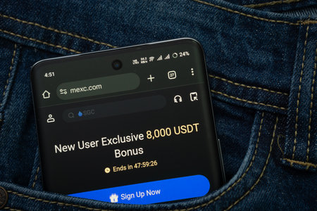Dhaka, Bangladesh- 15 June 2025: A smartphone displaying the MEXC web interface peeks out of a denim pocket.