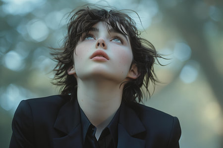 Featuring a young person in a black suit looking up, high quality, high resolution