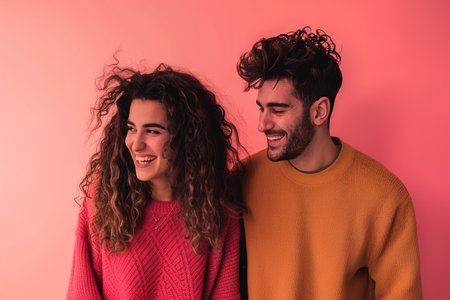 Stylish couple Funky young couple wearing sunglasses and smiling while standing against colorful background : Generative AI
