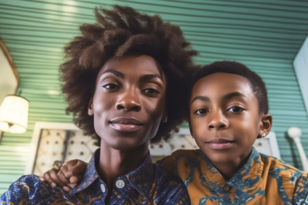 Generative AI : Joyful african american family mother and little boy son in Halloween costumes making scary gesture and looking at camera while sitting on sofa in decorated living