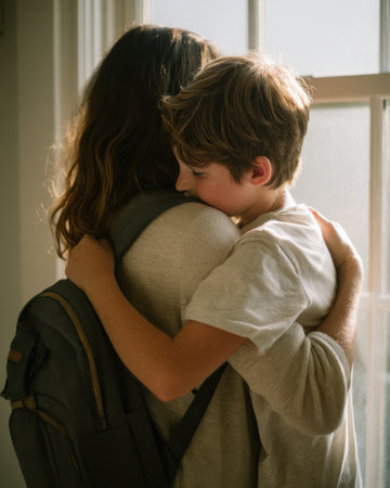 Young boy hugging his mother while wearing a backpack near a window, back-to-school goodbye moment showing emotional support and family care.