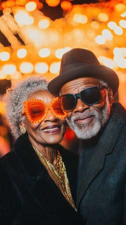 Happy, stylish senior African American couple at New Year street fair against background of warm festive garlands light. Bokeh effect.