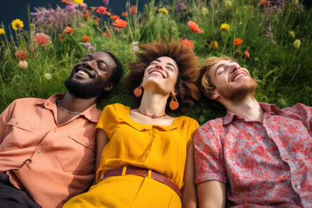 people with stylish attire and hairstyles, one wearing sunglasses, are lying down, seemingly relaxed and enjoying themselves