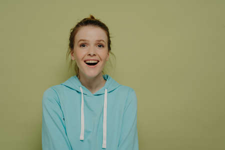 Amazed teenage girl with hair up wearing turquoise hoodie being excited after seeing something amazing, wow face expression and open mouth from amazement. Human emotions concept