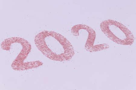 Side view of a composition of number 2020 made of pink sand laid out on a white background