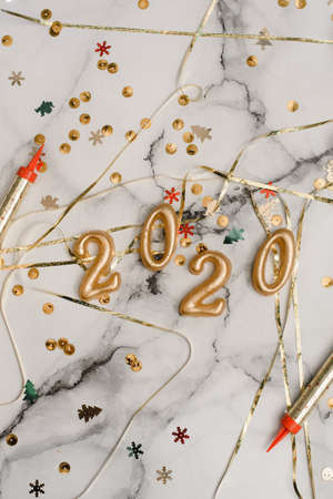 The concept of the new 2020 and Christmas. Gold numbers 2020, spangles and garlands on a marble background. top view, flat lay.