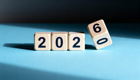 Wooden blocks with numbers spell out 2026 on a blue surface with a dark background. One block is turning, symbolizing the arrival of the new year and change.