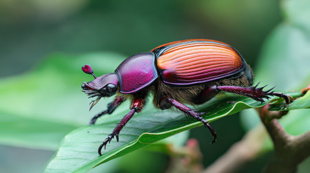 A vibrant beetle perched gracefully on a lush green leaf, showcasing intricate patterns and colors. This close-up captures the essence of nature's beauty and diversity.