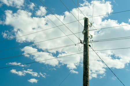 old wooden power post column entangled with live wires against the blue sky with clouds