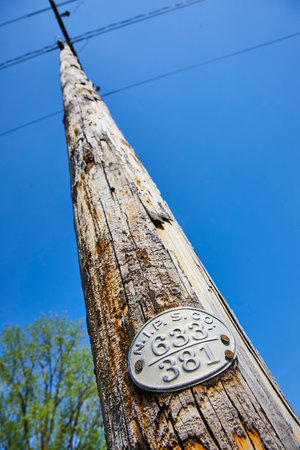 Aged wooden utility pole in Warsaw, Indiana, stands tall against a clear blue sky, symbolizing enduring connectivity.