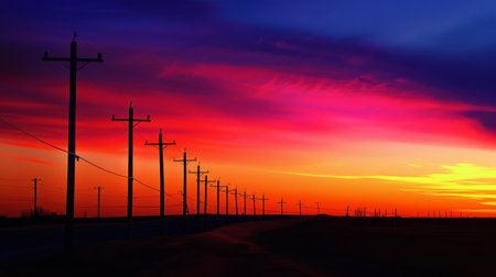 A striking view of telegraph poles reaching towards a vibrant sky. The image captures the intricate details of the wooden poles and the electrical wires against a backdrop of dynamic clouds. ai generated.