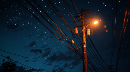 Night shot of an electric pole illuminated by streetlights, with wires casting intricate shadows on the ground. The background is a dark, starry sky.