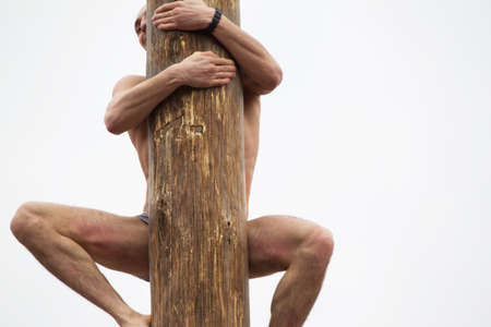 Belarus, Gomel, on March 12, 2016. Central square. Celebration of carnival. The man climbs on the pillar. Maslenitsa