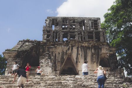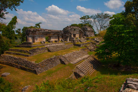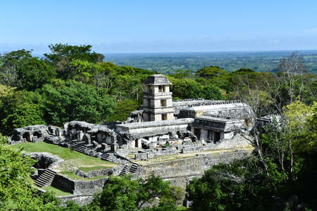 Palenque, Chiapas, Mexico: Ancient Mayan city among trees in Sunny weather. The archaeological area with the ruins