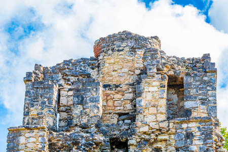 Ruined historic Architecture in the pre Columbian walled city of Tulum, in the Yucutan Peninsula in the state of Quintana Roo, Mexico