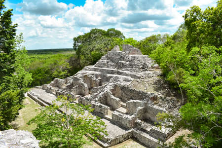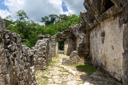 Ancient Mayan site with temple ruins pyramids and artifacts in the tropical natural jungle forest palm trees and walking trails in Muyil Chunyaxche Quintana Roo Mexico.