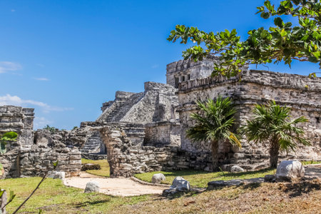 Ancient Tulum ruins Mayan site with temple ruins pyramids and artifacts in the tropical natural jungle palm trees landscape panorama view in Tulum Mexico.