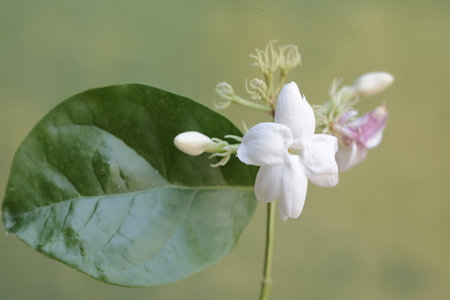 Close up of jasmine flower with green leaf on blurred background