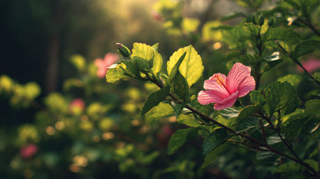 The Hibiscus in spring, fresh green leaves, soft sunlight filtering, vibrant atmosphere full of vitality, natural textures, serene mood.