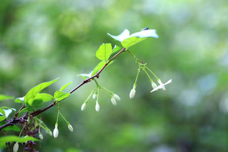 Jasmine flower on blurred branch and leaves background. White flowers as a background. Nature wallpaper concept.